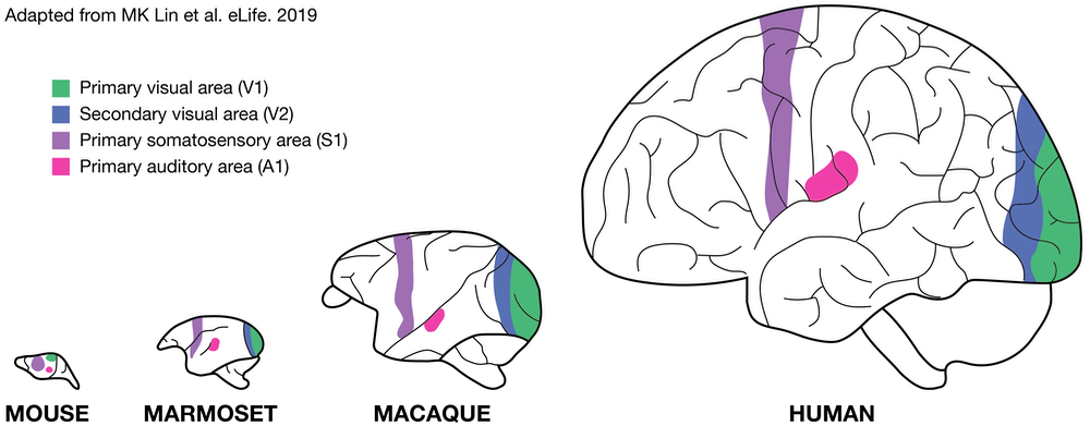 Although the marmoset brain is small, it retains anatomical and functional organization specific to primates, including humans. This includes a large neocortex, granular prefrontal cortex, expanded visual and auditory cortical fields and reduced olfactory regions. Like humans, the brain of marmosets have a large amount of white matter, a feature that makes them promising as a translational model of brain disease. The marmoset brain is also well suited for studying circuit wiring and connectomics in a complex NHP because it does not pose the same big data challenge for computational tools as the macaque brain which is several magnitudes larger.
