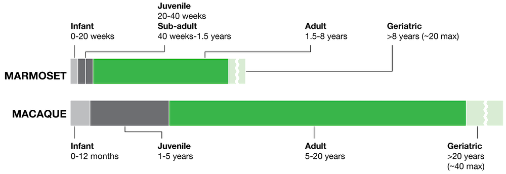 Notably, the time period required to move from early to late life (i.e. to advance through the stages of development, aging or chronic disease) is within the range of a typical, NIH-funded project. Macaques on the other hand do not reach sexual maturity and geriatric age until around 3 and 20 years, respectively.
